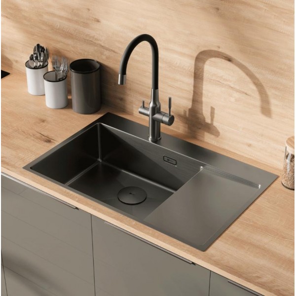 Устойчивость к коррозии. Нержавеющая сталь SUS 304 характеризуется наличием 18% хрома и 10% никеля, что гарантирует ей высочайшую устойчивость к коррозии. PVD-покрытие защищает мойку от воздействия влаги и агрессивных веществ, что особенно важно для кухонной мойки.