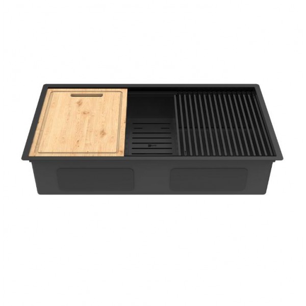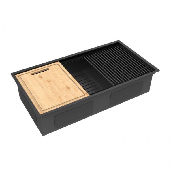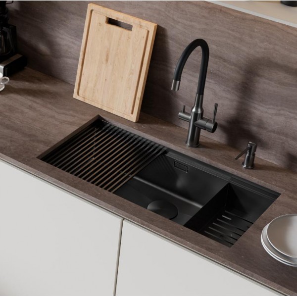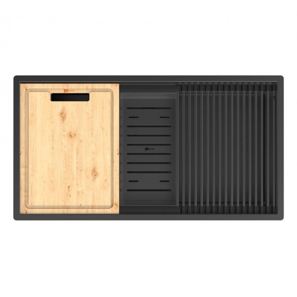 Кухонная мойка Lemark TABAGA 820 прямоугольная из нержавеющей стали с аксессуарами в комплекте: ролл-мат, коландер, разделочная доска цвет: Чёрный матовый 9932136